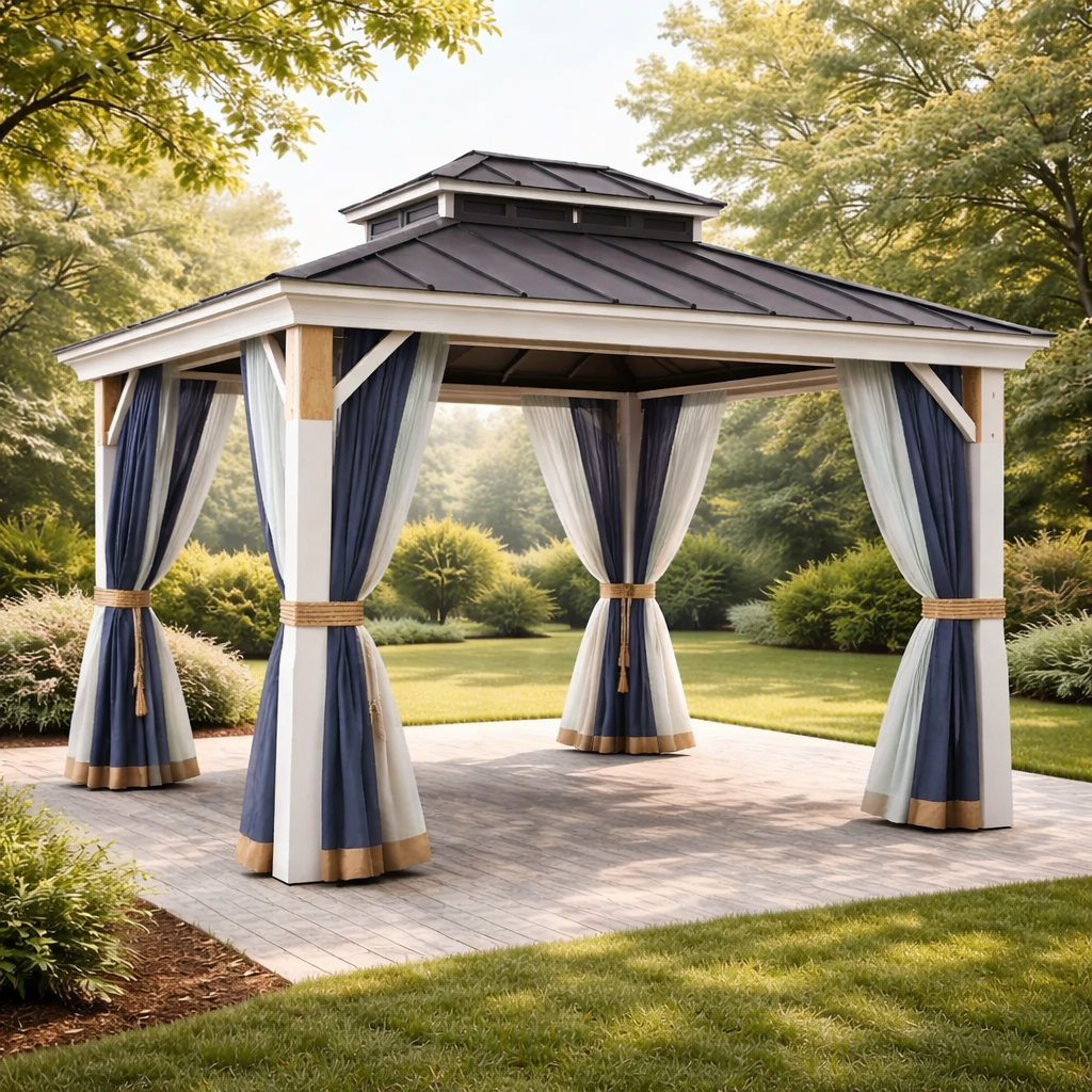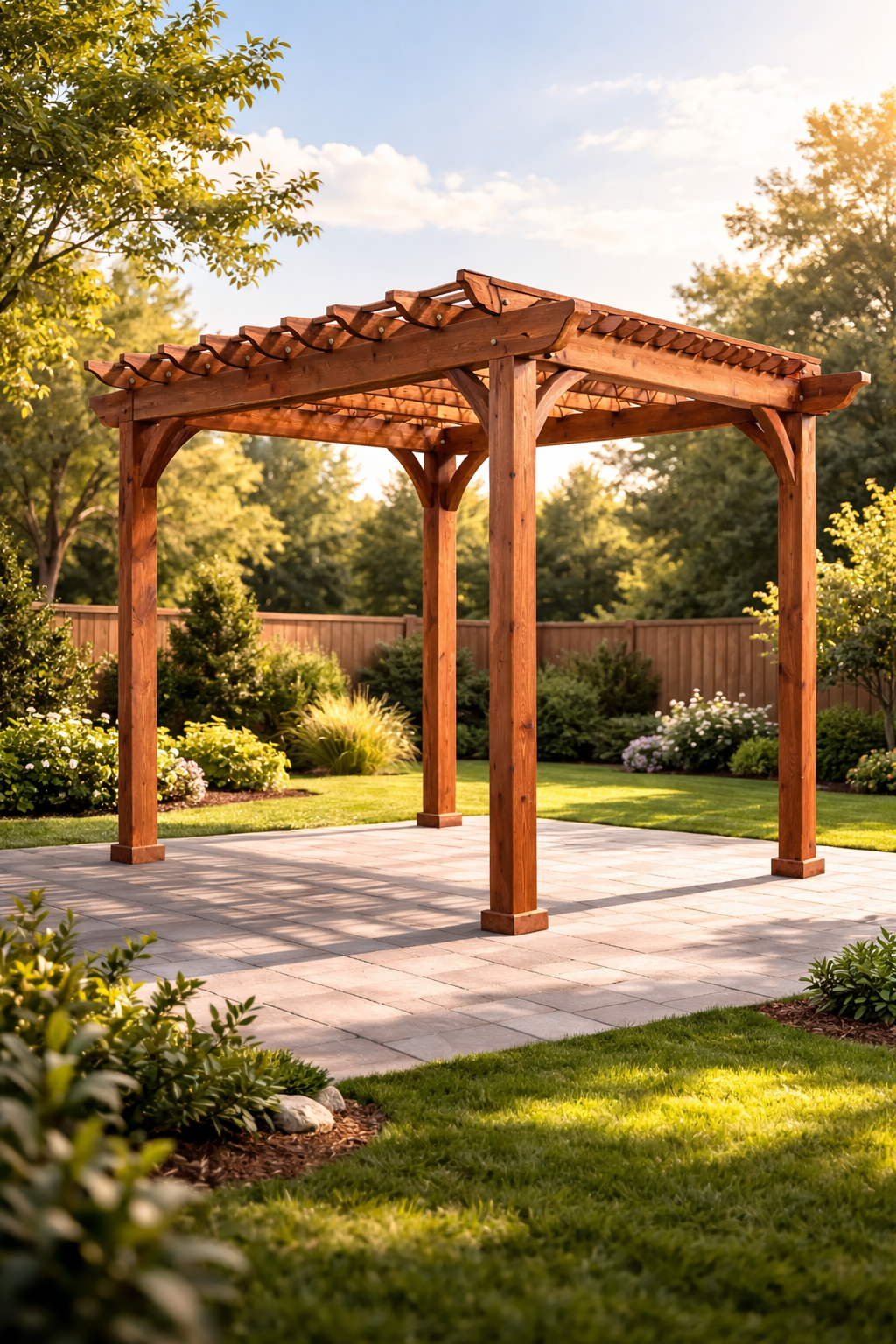 Conception en structure bois, adaptée aux espaces de jardin ou de terrasse, offrant une fonction de base d’ombrage et de délimitation de l’espace, compatible avec divers environnements extérieurs.